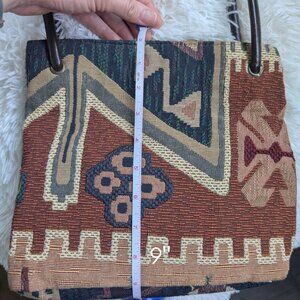 Add timeless vintage vibes to your wardrobe with this gorgeous Nine West tapestry purse from the late 90s/early 2000s. Featuring a rich Aztec-inspired woven pattern in earthy tones and structured dark brown faux leather handles, this bag is perfect for adding boho flair to any outfit.