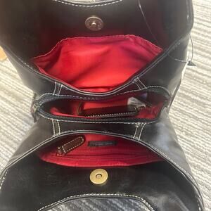 Features: structured mini hobo shape with single shoulder strap; exterior zip wallet pocket with card slots; magnetic snap main compartment; red satin lining with interior zip + slip pockets; contrast stitching; detachable ID tag
