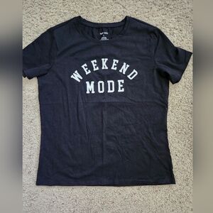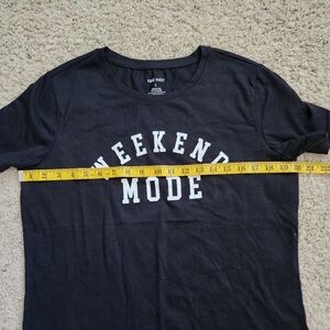 The Weekend Mode Round Neck Short Sleeve Black Top in size Large is a comfortable and versatile women's top perfect for various occasions such as travel, parties, casual wear, and workwear. Made from a soft and stretchy jersey fabric, this top features a graphic print of the Weekend Mode logo, making it a stylish addition to your wardrobe. With a pullover closure and wide straps, this lightweight top is easy to care for and suitable for all seasons, offering a breathable and comfortable fit for everyday wear.