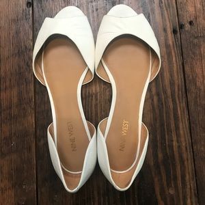Size 7.5 - Nine West peep toe white leather flats 🌹 Great shoes for dresses and skirts! Very gently used. Small scuff on side as shown in picture (not noticeable when wearing)☝️ Retail $69