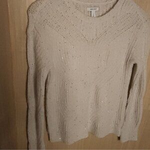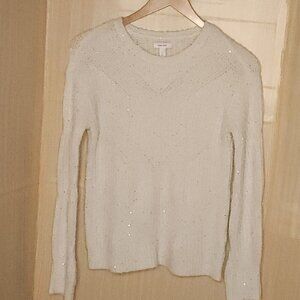 Nine West women’s white soft sweater with silver sparkle detail small. Gently used condition. Measurements are: 24 ½" sleeve, 25” from shoulder to hem, 20” from armpit to armpit.