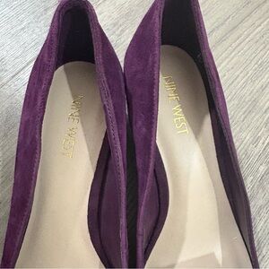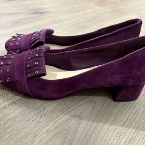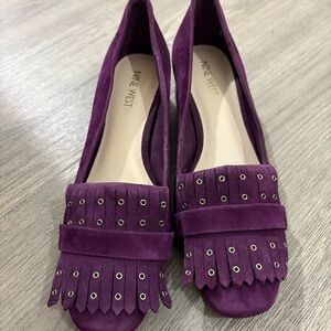 NEW WITHOUT BOX, sticker residue on bottom of one. This Nine West loafer is a stylish choice with its purple suede material and fringe accents. The round toe and slip-on closure provide comfort and convenience, while the low block heel adds a touch of sophistication. Perfect for various occasions from casual to formal, this pump in size 8 is embellished and features a solid pattern that stands out. Ideal for adding a pop of color to your outfit, this shoe exudes a classic yet trendy style suitable for office wear or a night out.