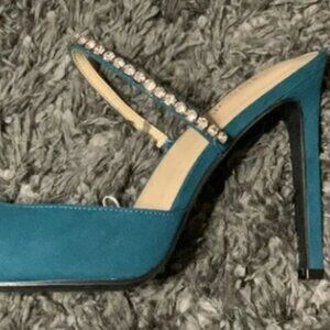 Nine West Woman Pointy Mule Faux Suede Teal with rhinestones