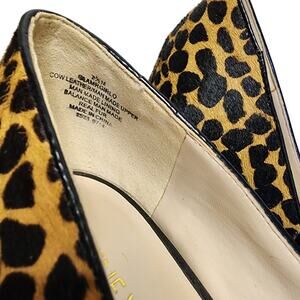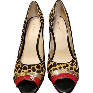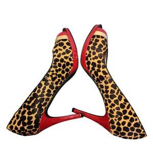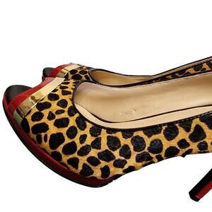 Excellent, used condition, size 7.5. Cheetah print cow fur, leather heels. Peep toe trimmed in red and gold. Please see pics for details and measurements. Gently worn. Smoke-free, ask any questions. Shop my closet for more great items: BUNDLE, BUNDLE, BUNDLE for discounts!!!