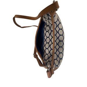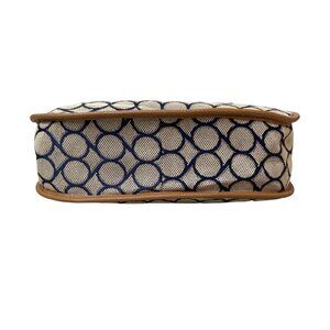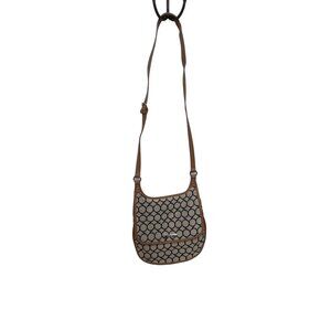 The Nine West Women's Crossbody Bag is a medium-sized shoulder bag in a beautiful mix of blue, tan, and brown. Made of cotton and man-made materials, it is free of scuffs, scratches, stains, discoloration, and cracks.
