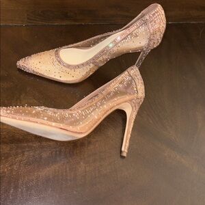 This pump features a translucent bejeweled mesh upper and a faux rhinestone covered sky high stiletto heel.