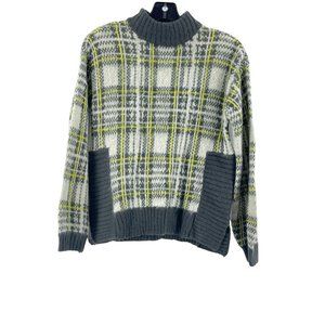 Nine West Women's Gray White Yellow Plaid Knit Sweater High Neck Top Size XS