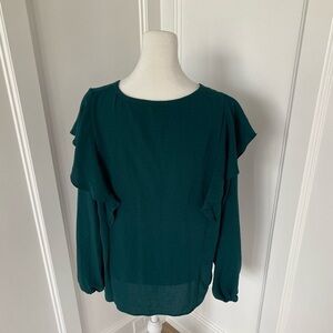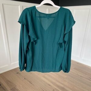 This blouse is new with tags and in excellent condition! There are no rips, tears, pulls, or stains. It has a vintage-like ruffle detail that comes down the front with fabric buttons. It is lightweight and can easily be worn all year round. The color is also perfect for the holidays! It is a very versatile blouse!