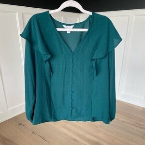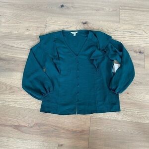 Nine West Womens Green Ruffle V Neck Long Sleeve Button Up Blouse NWT Size Large