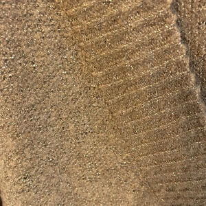 Nine West Women’s Large Camel Color Metallic Soft V Neck Pullover Tunic Sweater. Cozy Sweater with metallic threads throughout. Loose fit with side slits. Acrylic, nylon, spandex blend.