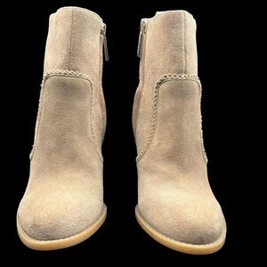 Nine West Women’s Leather Quicksand Ankle Boots Tan Size 5.5. Gently used, like new, in great condition. 3 1/2” high block heels and soft suede. Suede upper, slip on zip closure, heel loop tab. Classic chic look.