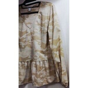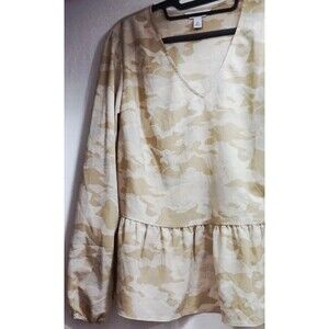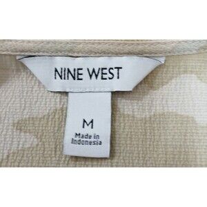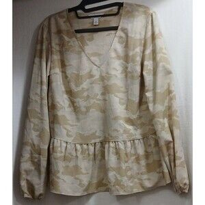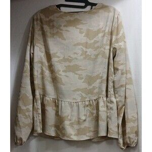 Nine West Women’s M Beige Camo Print Blouse Peasant Hem Long Sleeve Top EUC
