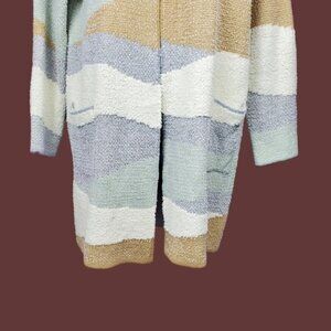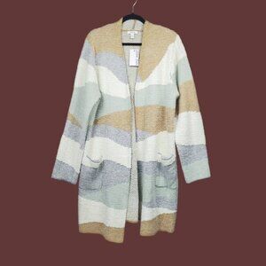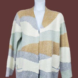 Nine West multicolor open front knit sweater cardigan in blue, sage green, tan, and ivory. Pockets. Open front. Textured knit. Spring fall winter casual comfy cozy chunky knit cardigan.