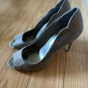 Step out in style with these elegant silver peep toe heels from Nine West. Perfect for any occasion, these shoes offer both comfort and sophistication.