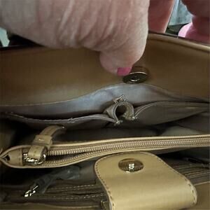 Keywords: Nine West, shoulder bag, leather, tan, medium, adjustable strap, multiple compartments, nickel hardware, casual, women's bag, pre-owned, top closure, handbag, fashion accessory.