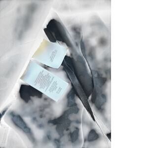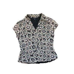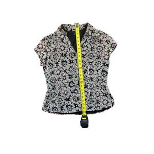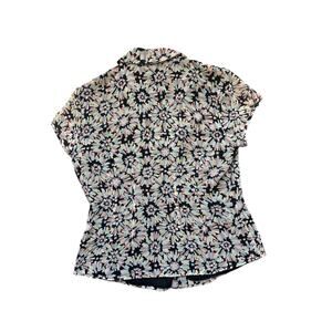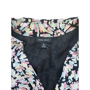 Chic and versatile Nine West short sleeve blouse featuring a black base with a pastel geometric floral pattern in shades of pink, yellow, and mint. Designed with a V-neckline and soft spread collar, this lightweight blouse drapes beautifully and flatters the silhouette.