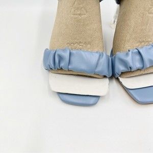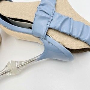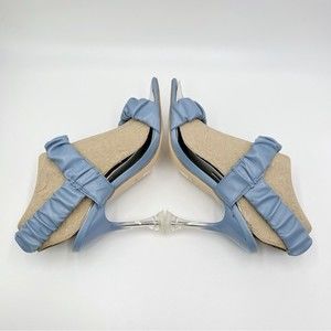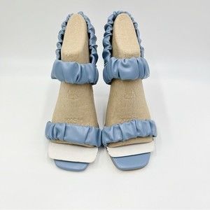 Nine West women's Zuzie cornflower blue faux vegan leather open toe dress sandals / heels. Ombre architectural heel. Women's size 6.