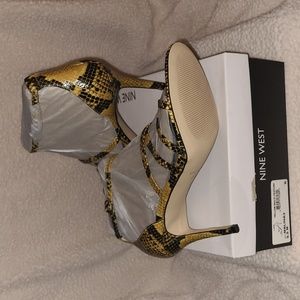 Nine West Women's strappy stiletto sandals yellow and black snakeskin print 9.5 Brand new unworn with box. Reasonable offers considered.