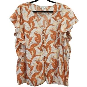 Nine West XXL Button Front Blouse Earthy Boho Leaf Print Flutter Sleeve Fall
