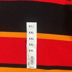 Nines West Plus sized Striped Sweater features classic Black Red and Oranged Strips. The ribbed hem and cuffs provide a