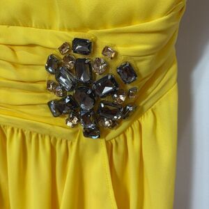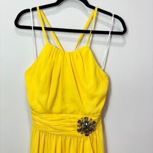 Features: Nine West Yellow Halter Dress. Pleated and Brocade Accent at the Waist. Ruffles flowing down on one side. Fabric is lightweight. Fully lined. Back has crisscross straps.