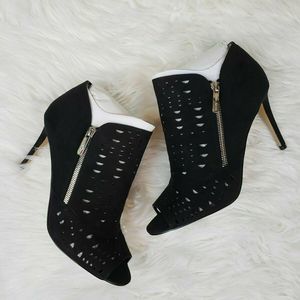 This perforated heeled shoe has an open toe. A stiletto heel elevates this lasercut peep toe bootie. Soft faux construction adds an elegant touch to an edgy style.