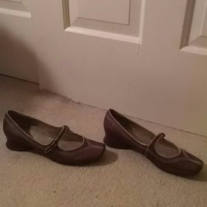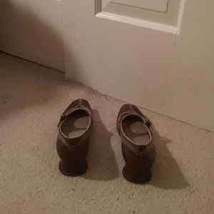 Gently used, distressed brown with cream stitching. Mary Jane style flat.