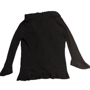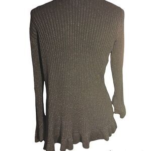 Womens black with gold flecks ruffled, bell sleeves satin blend Nine West cardigan. Has one hook closure at waist line. Ruffled hem.
