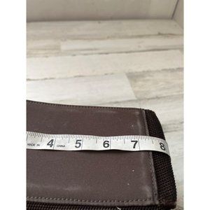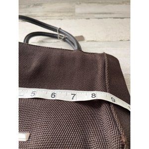 Nine West brown short handled zippered bag. Has one zippered pocket inside. Hanging silver charm does have scratch on one side, otherwise good pre-owned condition.