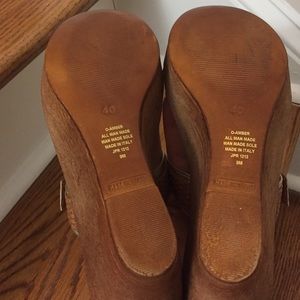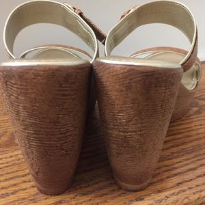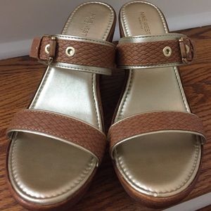Made in Italy, these are made to last, the heel is made of a sturdy polymer, that will not stain or flake. The Insel is curved and cushioned for comfort. The patterned faux "leather" looks like a basket weave. Barely worn