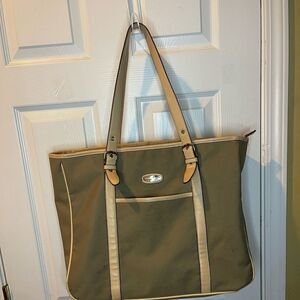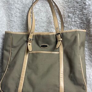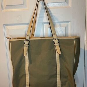 Nine West extra large tote bag Olive green fabric beige faux leather trim &strap