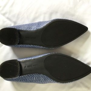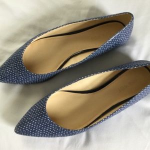 Blue flats with white speckles. Size 11M. Hardly worn. Slight wear spot on outside (see closeup shot) Man made material.
