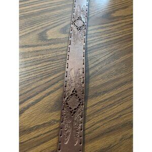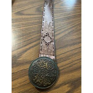 Nine West genuine leather copper brown belt size Small. Belt has butterflies throughout belt. Some verdigris on back side of circular buckle (see photo) otherwise , good pre-owned condition.