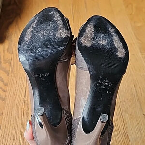 Cute pumps in gray leather with fabric accents on the heel cage and fun bow on the toe box. Some water stains on the heel cage and front of the left shoe (see pics).