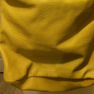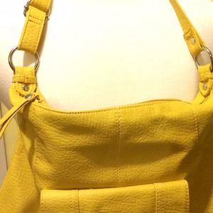 Nine West mustard handbag with pocket outside. Last picture is slight discoloration because it was rubbing on my jeans but it could maybe be clean. Measures 11 in length and 13 width. Slightly used but still in good shape.