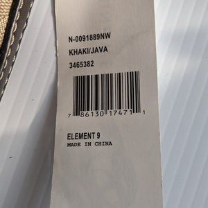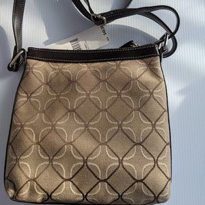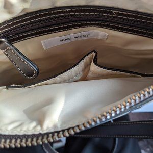 Nine West Element 9 NWT khaki-colored crossbody bag/purse, has a front snap pocket, zip close at the top, inside has a zipped pocket on one side and an open pocket on other. Inside is cream colored with dark brown trim on pockets. Size is approximately 9" x 9" x 2". Pretty design on front and back with dark brown trim. Adjustable strap.