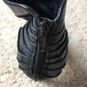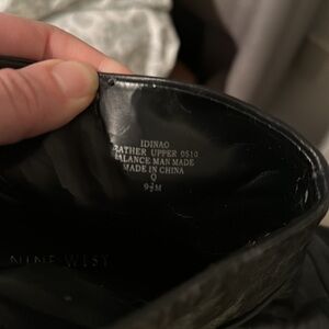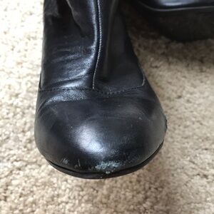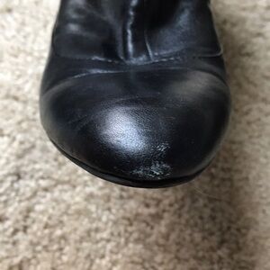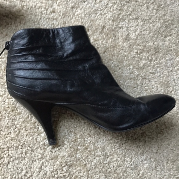 Gently used leather healed bootie by Nine West in size 9.5. They have a zip back and a cute scrunch detail around the ankle. The heel is about 3 inches. These are very easy to wear. The wear of the shoe is mostly on the front toe and the heel portion as shown in the pictures. There is minimal wear on the leather. Smoke free home.