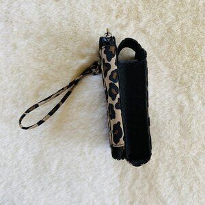 This leopard print cell phone holder wallet wristlet features an open slot with elastic sides and a zippered wallet compartment that will hold your coins/cash in a zippered section on one side and 3-card slot on the other side (2-credit cards slots and a clear front ID slot).