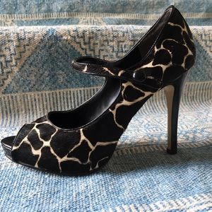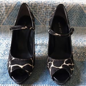 Nine West "Luminous" open toe Mary Janes. Leather upper with pony hair in a black and off-white giraffe print. Approx. 4.5" heel made more comfortable with hidden platform. Size 6. Only worn a few times and in excellent condition! No noticeable scratches or dents- black patent on toes and heels is nearly flawless.