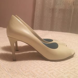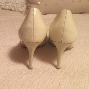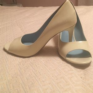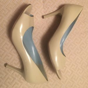 Nine West Patent Leather peep toe heels Size 6 1/2 M. (Off white-very light cream) These shoes do look great on but they do have some marks in various areas. Please zoom in on the pictures.