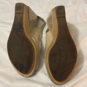Wood and patent leather make these open toes the perfect pairing for coming spring.