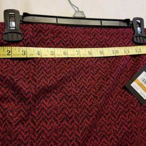 Classy Nine West skirt, NWT, pretty cranberry color with black detailing. Size small; lined, no slit(s). Lying flat, the waist is 15 inches while the bottom hem is 18 1/2 inches.
