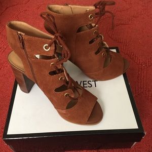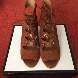 Women's Sandals, Open Toe - Corset-inspired laces highlight a bootie-inspired open toe sandal resting on a chunky 3 1/2" heel. suede upper. High. Imported. Color: Brown Suede, Size: 8 1/2 They are in brand new condition. Only wore ones for about 4 hours.