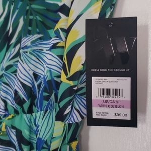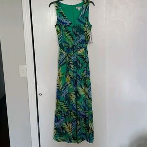 Brand new, never worn, sleeveless, v-neck, elastic waist with tie detail, fully lined dress. Back zip closure. Approximately 56 inches long, 40 inches long from the waist.