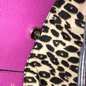 It’s a bit worn out I’ve had it for forever and it’s been with through so much lol! But it never use it now so I’m selling it cheap. The inside in leopard print and the purse is a sort of magenta color.