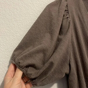 Preowned nice condition. Nine West size small romper. Color is a brownish army green. Not quite brown and not quite green. Drawstring waist. Balloon short sleeve. Size and name brand tag is hanging on one side. Other than that no damage. Has pockets!!