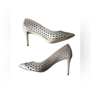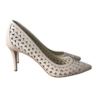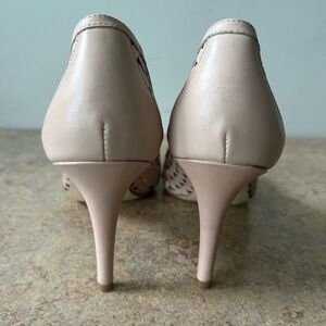 Nine West leather pumps with heart shaped cutout pattern. Nude flesh tone with subtle rose hue. 3” heels.