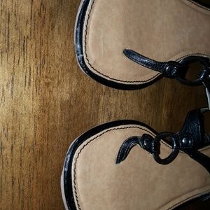Black sandals with silver rings, worn, small scuffs at the front of shoes