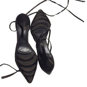 Nine West size 10 black pointed toe pumps with ties at ankle rubber no slip heel