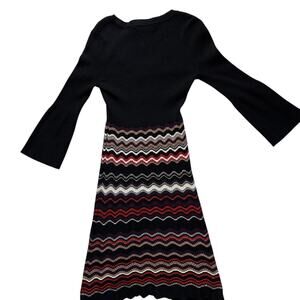 • Color/Pattern: Solid black top with multicolor zigzag/chevron knit skirt (red, burgundy, tan, cream, and black tones)